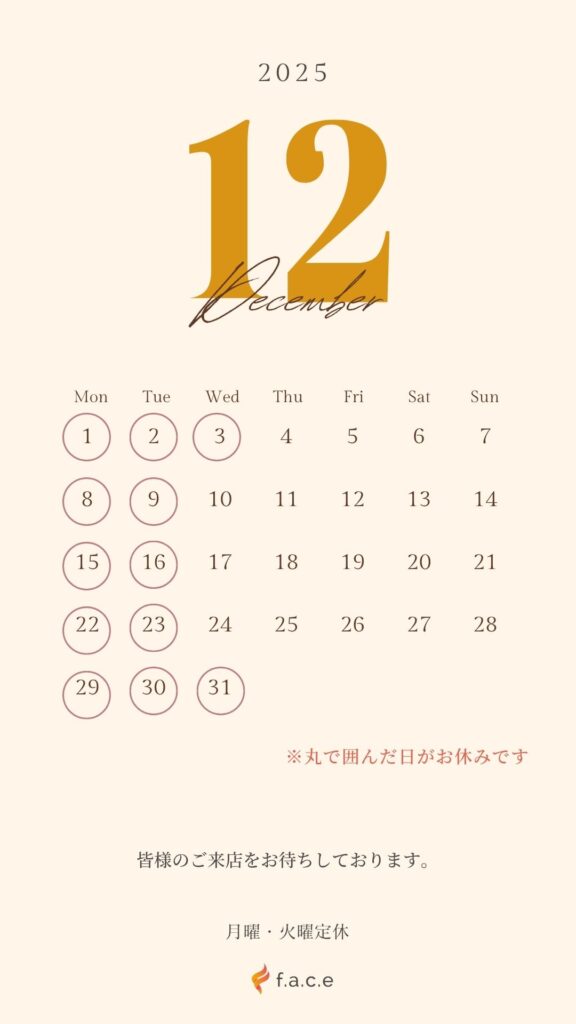 こんにちは!静岡県磐田市の美容室faceです。営業日カレンダーをお届けします。画像の丸で囲った部分が定休日となります。